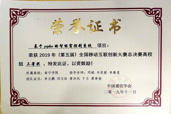 “基于ZigBee的智能窗控制系统”项目斩获三等奖
