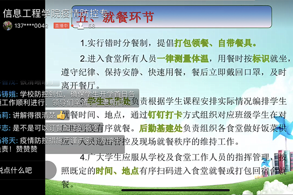 为进一步提高教职工的疫情防控意识,指导教职工做好个人防护、提高应急处理能力,做到科学有序开展疫情防控,有效落实学校及上级单位疫情防控措施,信息工程学院于4月23日晚举办了教职工疫情防控专题网络培训。培训由学院刘泉生副院长主讲,全院教职工及住校家属通过钉钉APP视频会议参加培训。