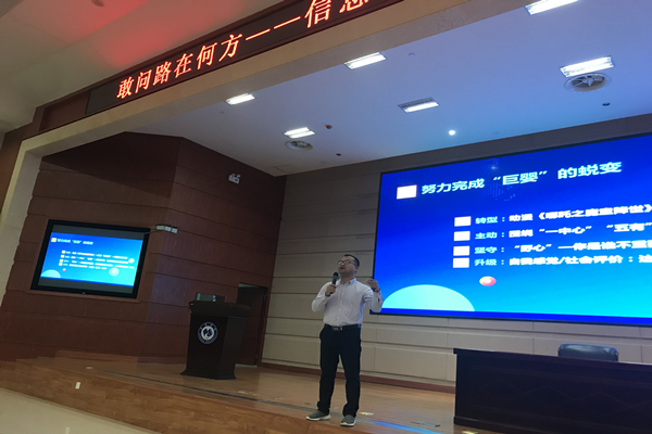 讲座上,邓副院长以“敢问路在何方”为题,围绕近三年我区毕业生就业状况,详细分析了信息技术服务行业的就业形势、就业情况和就业流向等,结合历届毕业生曾遭遇的不知所向、不知所选而呈现出的迷茫、焦虑、烦躁等心理困惑现象,深刻剖析了网络空间“两向撕裂”给深陷网络大潮的大学生带来的负向影响,阐明“奋斗”与“拼搏”才是当前青年大学生实际生活态度最贴切的群体标签。通过重温家长“口头禅”和分析《哪吒之魔童降世》、《夺冠》等热播影片,并结合学院近两年优秀校友的就业案例,提示毕业生“人生要有前瞻性”,需提前做好人生规划,并以“转型”、“主动”、“坚守”、“升级”等四个关键词勉励同学们努力完成“巨婴”的蜕变,找到属于自己的人生路。