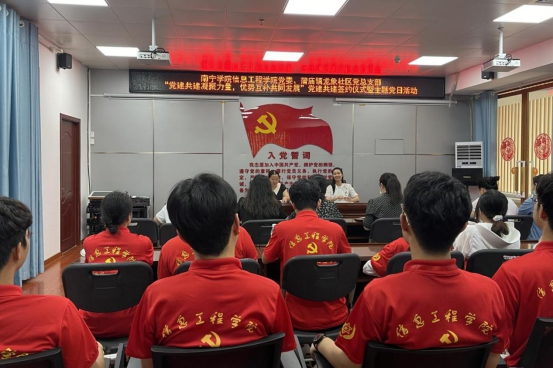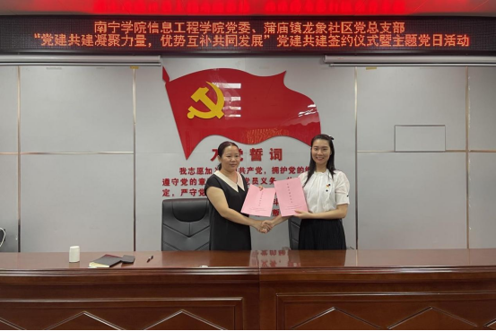 为贯彻落实党的二十大精神,增强高校党支部组织功能,优化基层党建工作体系,提升党建工作效能,2023年5月23日下午,南宁学院信息工程学院党委与蒲庙镇龙象社区党总支部开展合作交流座谈,签订《党建共建协议书》。本次签约仪式参会人员有:蒲庙镇龙象社区党总支书记颜桂凤书记、信息工程学院党委副书记、副院长岑铭君、信息工程学院学生第一党支部书记梁梦瑶、学生第二党支部书记叶星彤、学生第三党支部书记杨昌俊、学生党支部党员及龙象社区党总支部工作人员。