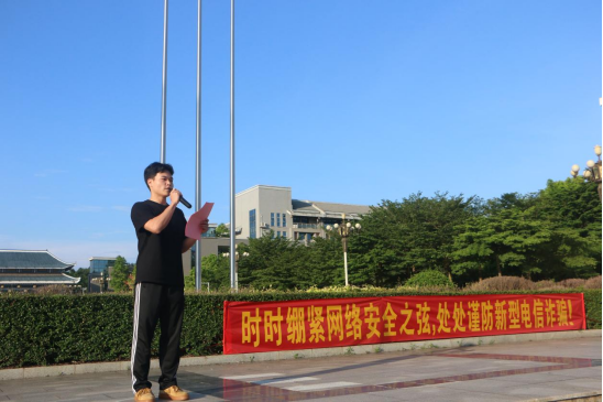 为了提高我院同学们对反诈手段的认识和基本安全防范意识,保护好个人财产安全,维护社会秩序稳定。我院于2023年6月19日7点在南门主席台前举行主题为“时时绷紧网络安全之弦,处处谨防新型电信诈骗”的升旗仪式。本次升旗仪式由陈钰成主持,信息工程学院领导老师、2022级信工学子和全体学生干部参加本次仪式。