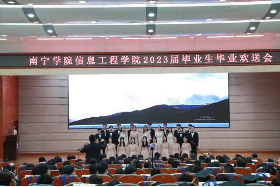 教师代表和毕业生代表一齐上台合唱歌曲《再见》,跟随着音乐声,信息工程学院记忆徐徐浮现。接着,全体师生起立共同奏唱南宁学院校歌《锦绣前程,充满阳光》共同表达对学校的热爱,祝福南宁学院蒸蒸日上、再创辉煌。