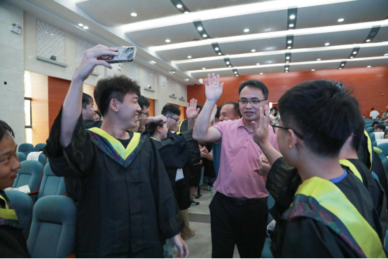 在师生热烈的掌声中,李庆年院长为2023届毕业生上最后一堂课,他说,2023届毕业生是不平凡的一年,同学们见证了新中国成立70周年,建党100周年,克服了疫情三年的重重考验,经历了信息工程学院的改革,发挥了信工学子突破自我,追求卓越的优良品质,为学院取得丰硕成果添砖加瓦,在信息工程学院历史篇章上落下了浓墨重彩的一笔。“在未来的每一天,不管是孤身走暗巷,还是与绝望对峙,南宁学院‘自觉自强,厚德厚学’校训都能化作你们坚强的后盾。他深情寄语每位毕业生,今天离别后,路漫漫其修远兮,请你们上下求索,化身乘风而起的大鹏,在锦绣阳光的未来,扶摇直上九万里,在广阔的天地中,拥抱未来!”