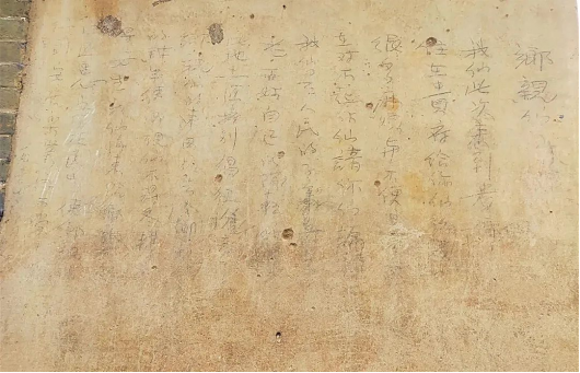 随后,陈熙成书记亲自担任讲解员,带领实践团和村里的党员群众参观了剿匪时的战斗遗址和中国人民解放军七三大队在周屋村祠堂边一间土坯房墙壁上的题词:“乡亲们:我们此次来到贵乡,住在贵府,给你们增添了很多麻烦和不便,是实在对不起你们,请你们原谅!我们是人民的子弟兵,是老百姓自己的队伍。听说此地土匪特别猖狂,抢去乡亲们的东西,拉去乡亲们的耕牛,使乡亲们不得冬耕,不得安生,我们特来给乡亲们解除匪患,安定民生,使乡亲们得到安居乐业,再不受土匪的残害。土匪不灭,大军不收兵!——中国人民解放军七三大队”。