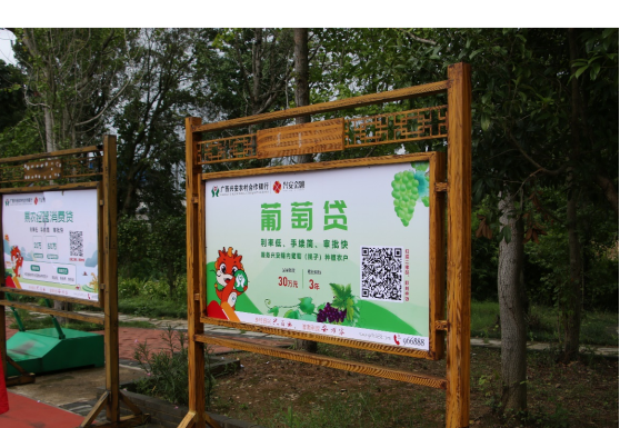 随后,南宁学院“萤火探兴”乡村振兴实践团跟随赵德新副书记的脚步来到了五架车村的村民活动广场,映入眼帘的是一个韵味十足的宣传栏,上面打着“葡萄贷”的标志。当地政府为了让村民放宽心,有信心,无负担地去种植与经营葡萄产业,多家银行展开合作,可向辖内的葡萄种植户提供利率较低的信用贷款。
