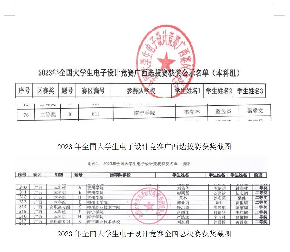 2023年全国大学生电子设计竞赛(TI杯)全国总决赛近日在桂林电子科技大学花江校区举行。我院组织7支队伍参赛,经过广西区选拔赛、全国总决赛的激烈角逐,物联网工程专业学生肖超江、何德华、韦姜铖获得国赛二等奖,韦克林、蓝昱杰、梁馨文获得广西区赛二等奖。