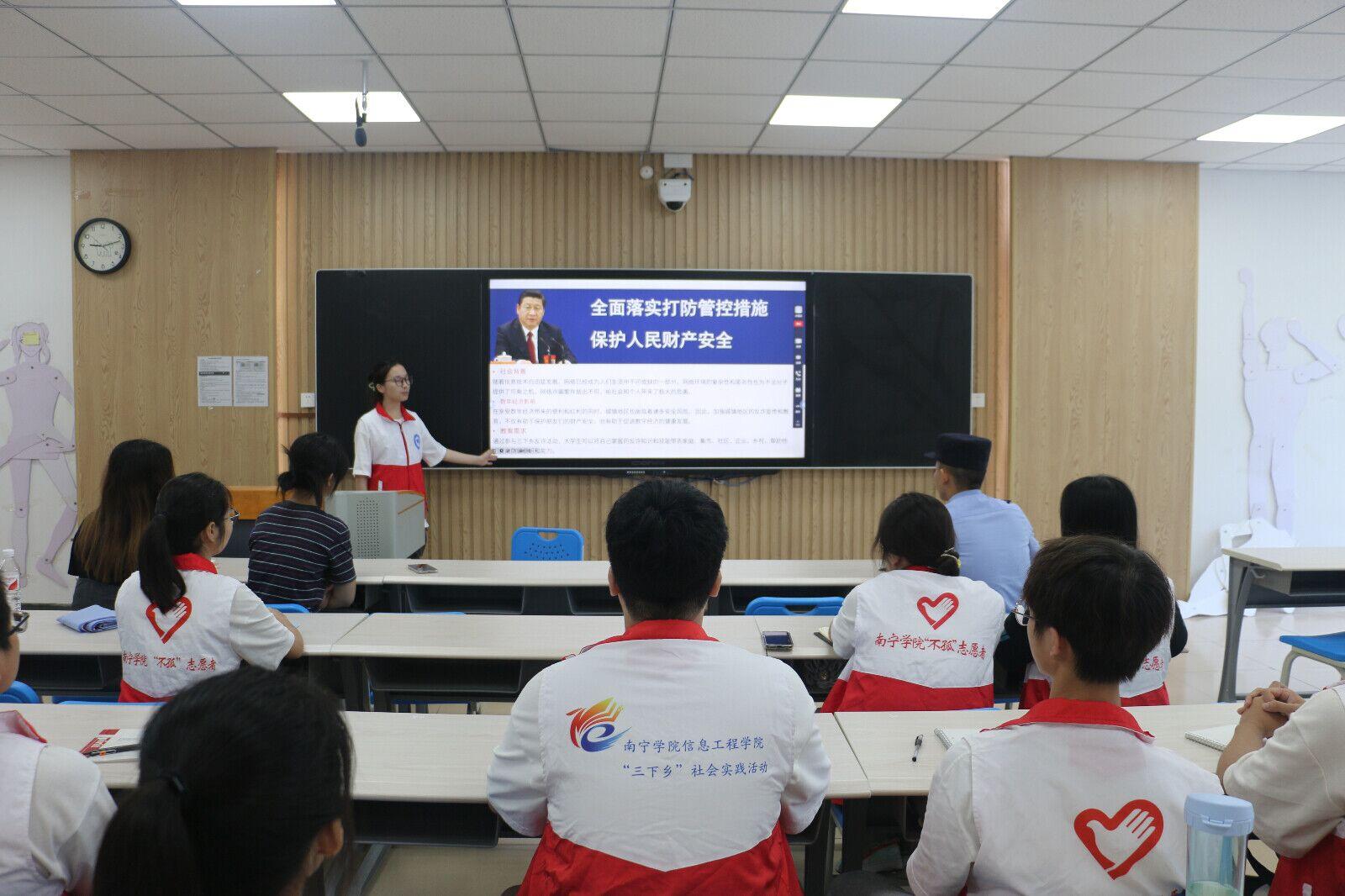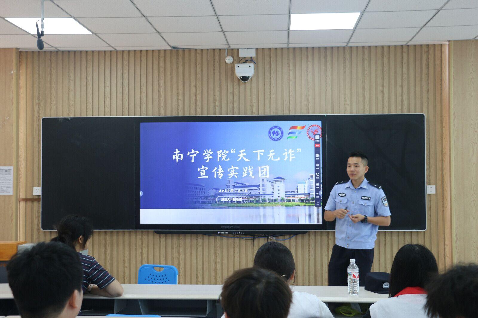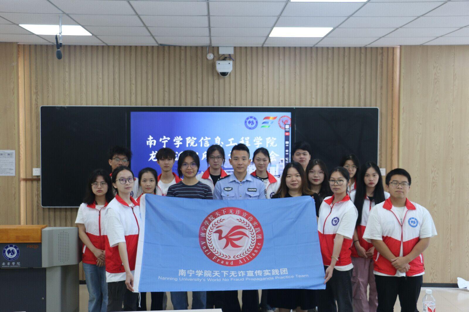 为深入贯彻落实中宣部、公安部“全民反诈在行动”集中宣传月工作部署,进一步增强我院师生的防骗意识和识骗能力,积极营造全民反诈的浓厚氛围,信息工程学院组建了由16名师生组成的“天下无诈”宣传实践团,于近日在南宁市各社区开展“全民反诈”系列社会实践活动。7月8日,“天下无诈”宣传实践团组织召开反诈工作专题交流会,邀请南宁市邕宁区龙岗派出所聂警官为实践团全体成员开展反诈知识培训。