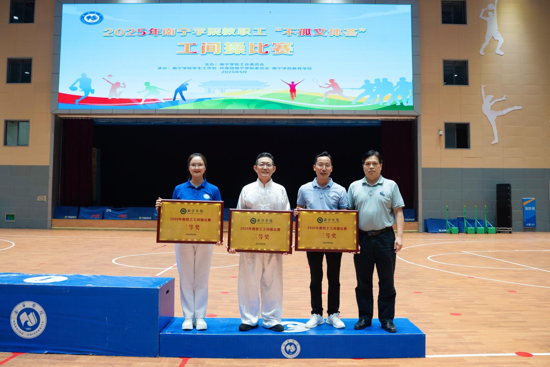 5月27日晚,南宁学院2025年教职工“不孤文体荟”工间操比赛在体育馆圆满举行。信息工程学院教职工代表队凭借出色的表现,在12支参赛队伍中脱颖而出,荣获比赛三等奖。