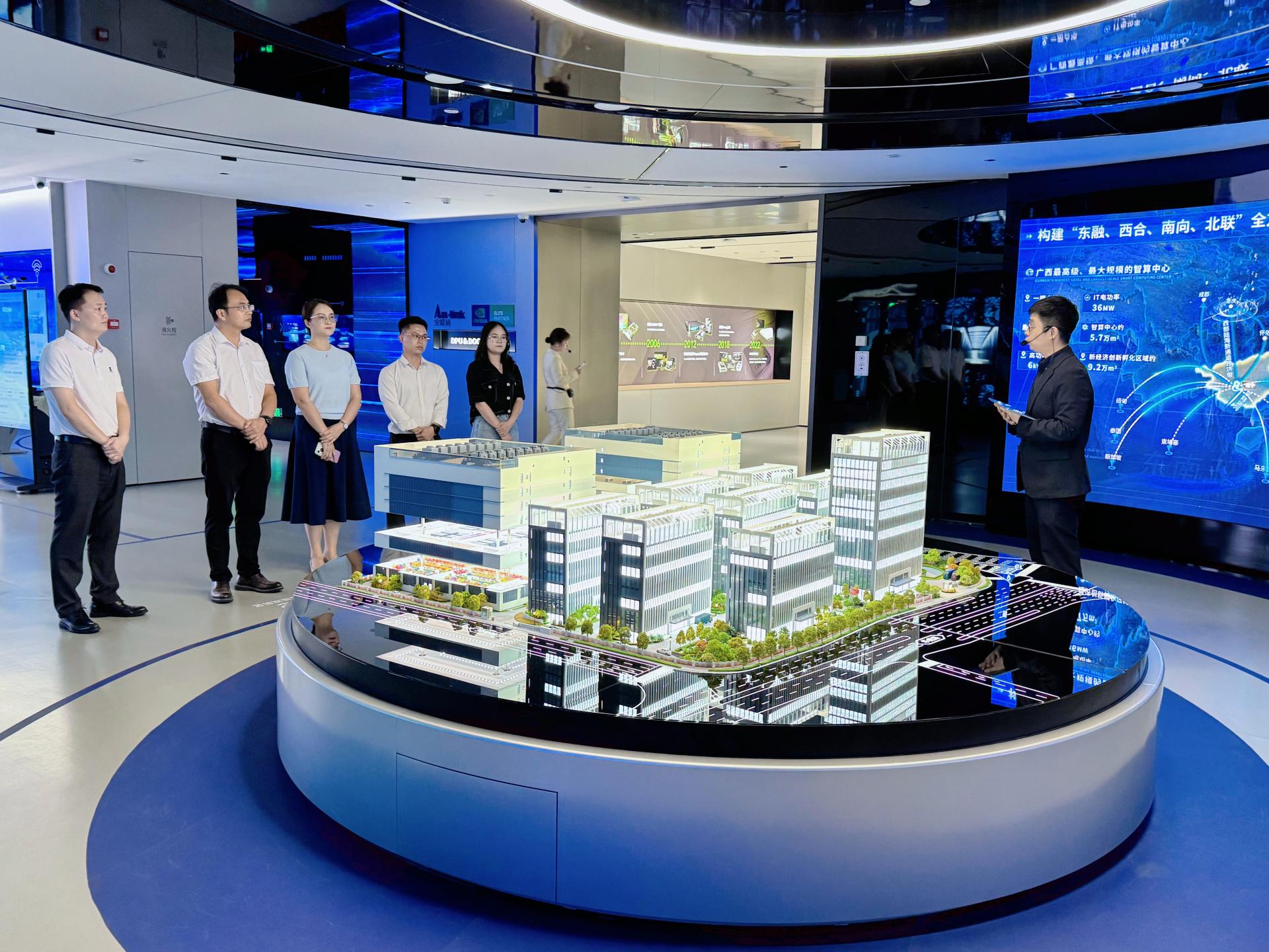 交流伊始,学院一行在润建股份广西公司教育行业总监陈志鹏陪同下参观了人工智能展厅。展厅通过实物展示、动态演示与案例讲解,全面呈现了公司在人工智能技术研发、行业应用解决方案及战略布局方面的前沿成果。李庆年院长在参观中就技术细节与应用前景与企业方深入交流,并思考如何将产业前沿知识融入教学,以增强人才培养的针对性与实用性。