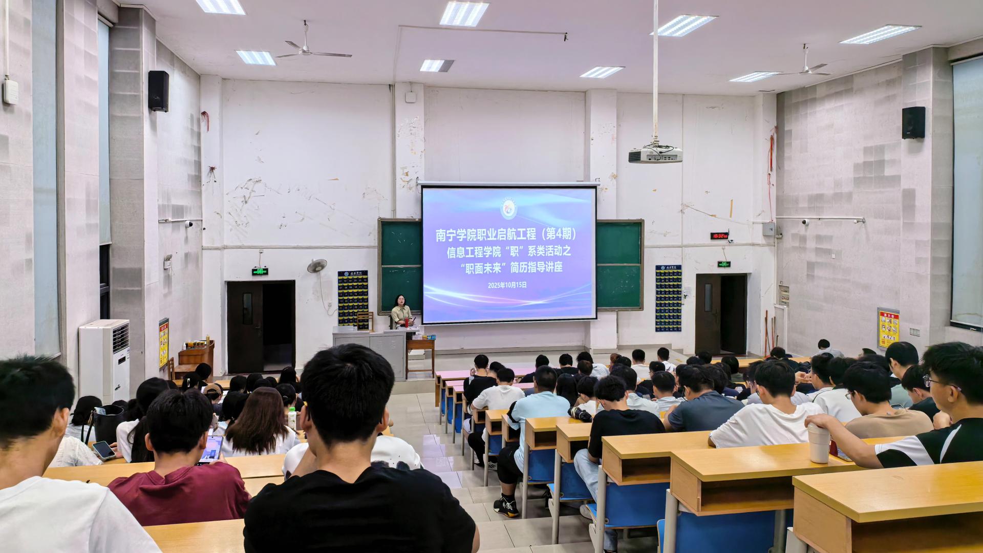为助力学子提升简历撰写能力、明晰就业方向,10月15日,南宁学院职业启航工程(第4期)信息工程学院“职”系类活动之“职面未来”简历指导讲座,在敷文园C104室顺利举办。本次活动特邀赵靖隆老师担任主讲,学院2026届毕业生170余人参加讲座。