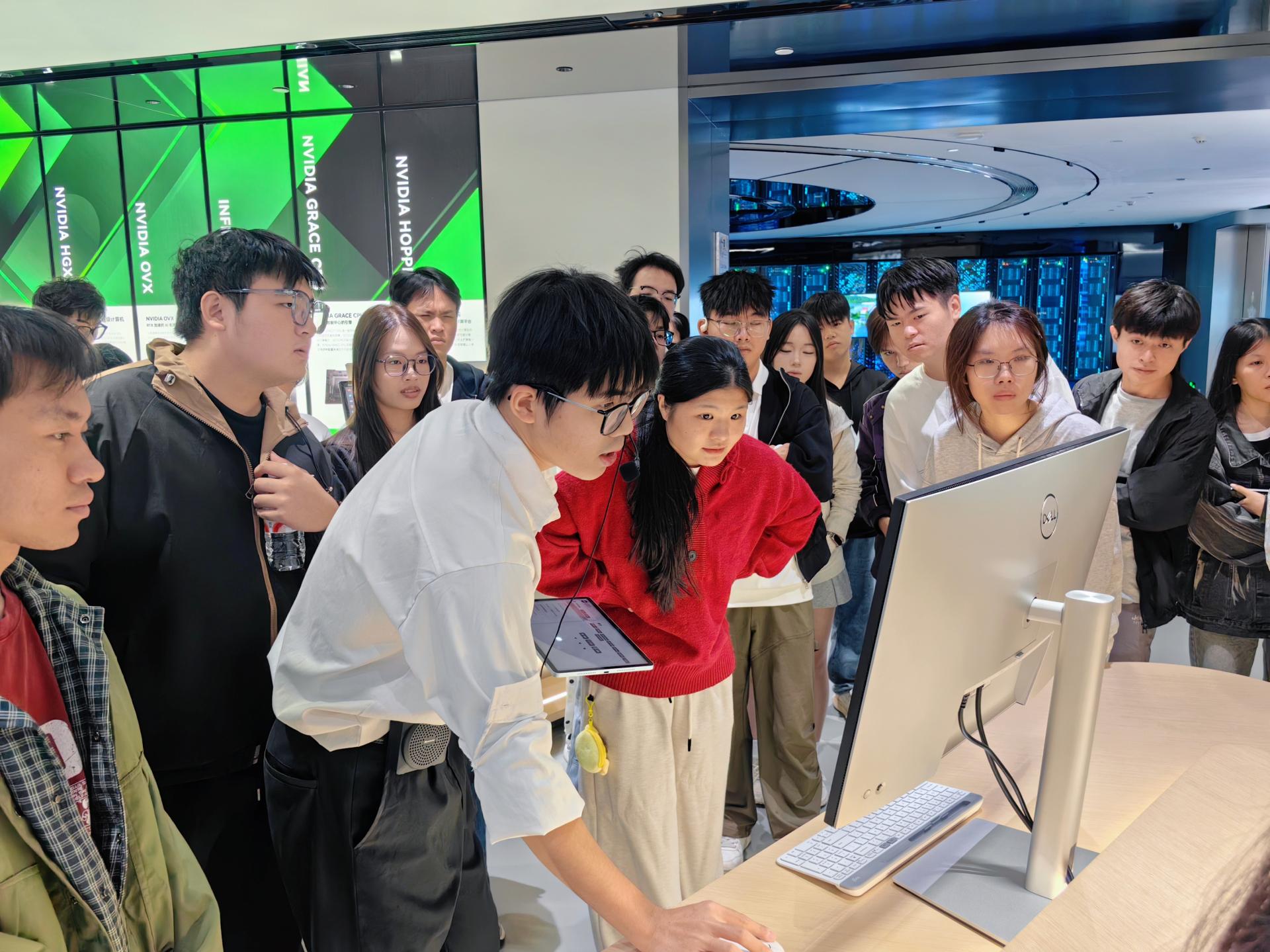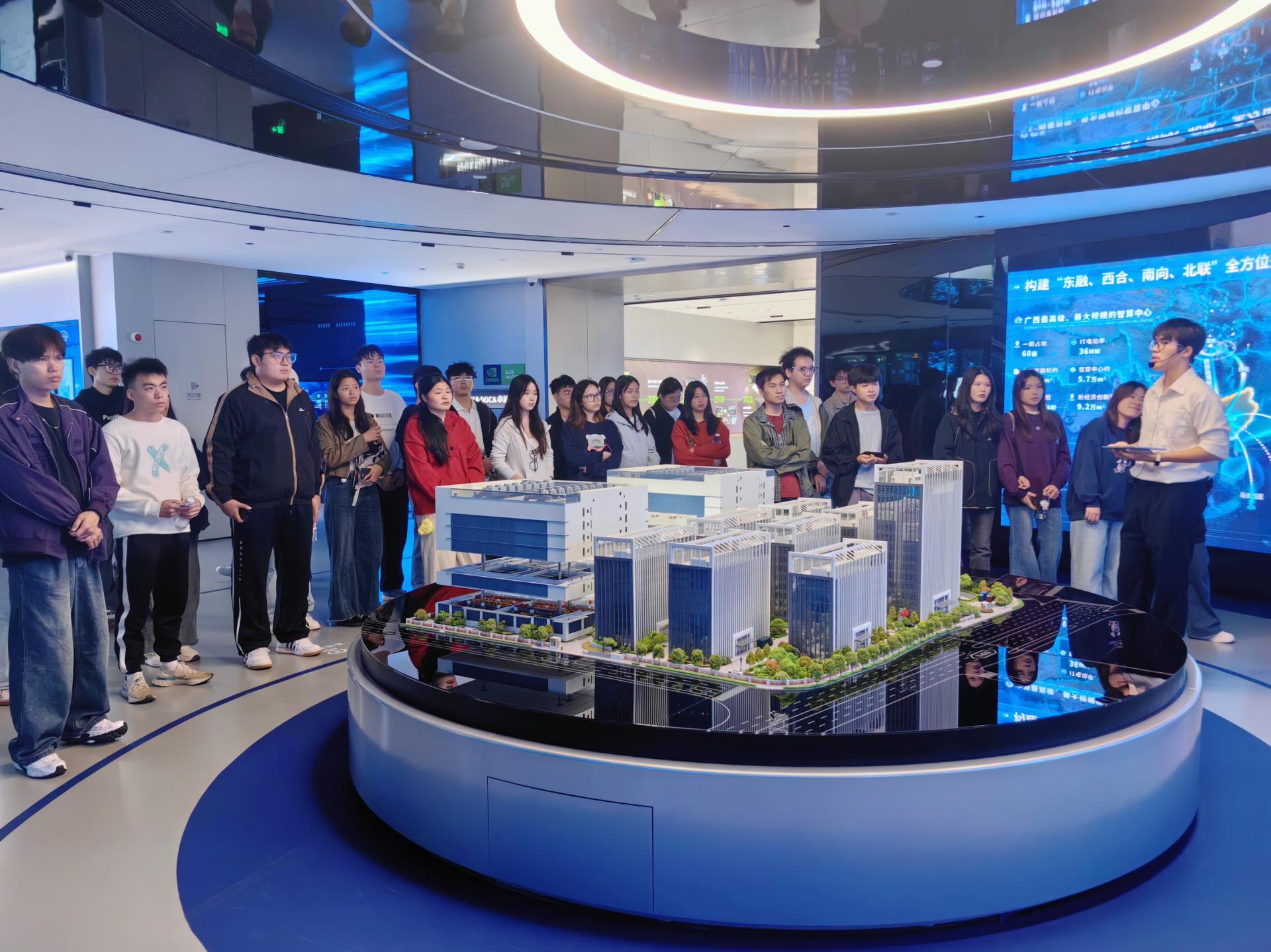 在润建股份有限公司市场部同事王健博的引领下,师生们沉浸式地观摩了企业人工智能展厅。展厅全方位展示了公司在多个前沿领域的创新成果:“AI与算力创新”展区,展示人工智能战略布局、五象云谷智算中心服务能力及“曲尺” 人工智能行业模型平台;“数智融合实践”展区,以AI+数智城管、AI+数字乡村等场景,让师生直观了解数智技术应用;“绿色能源科技”展区,聚焦AI+通信综合能源、光伏管维、虚拟电厂等关键场景,展现数智化产品与服务魅力;“低空经济发展”展区,借实物设备呈现无人机智慧巡检、北斗高精度监测等创新突破;“数智出海实践”展区,展示中国-东盟智能云平台推广、东盟产业园区信息化建设等项目,彰显助力东盟企业数字化转型的担当。在参观过程中,同学们与企业进行面对面沟通,不仅解开了心中的专业困惑,更帮大家明晰未来努力方向。
