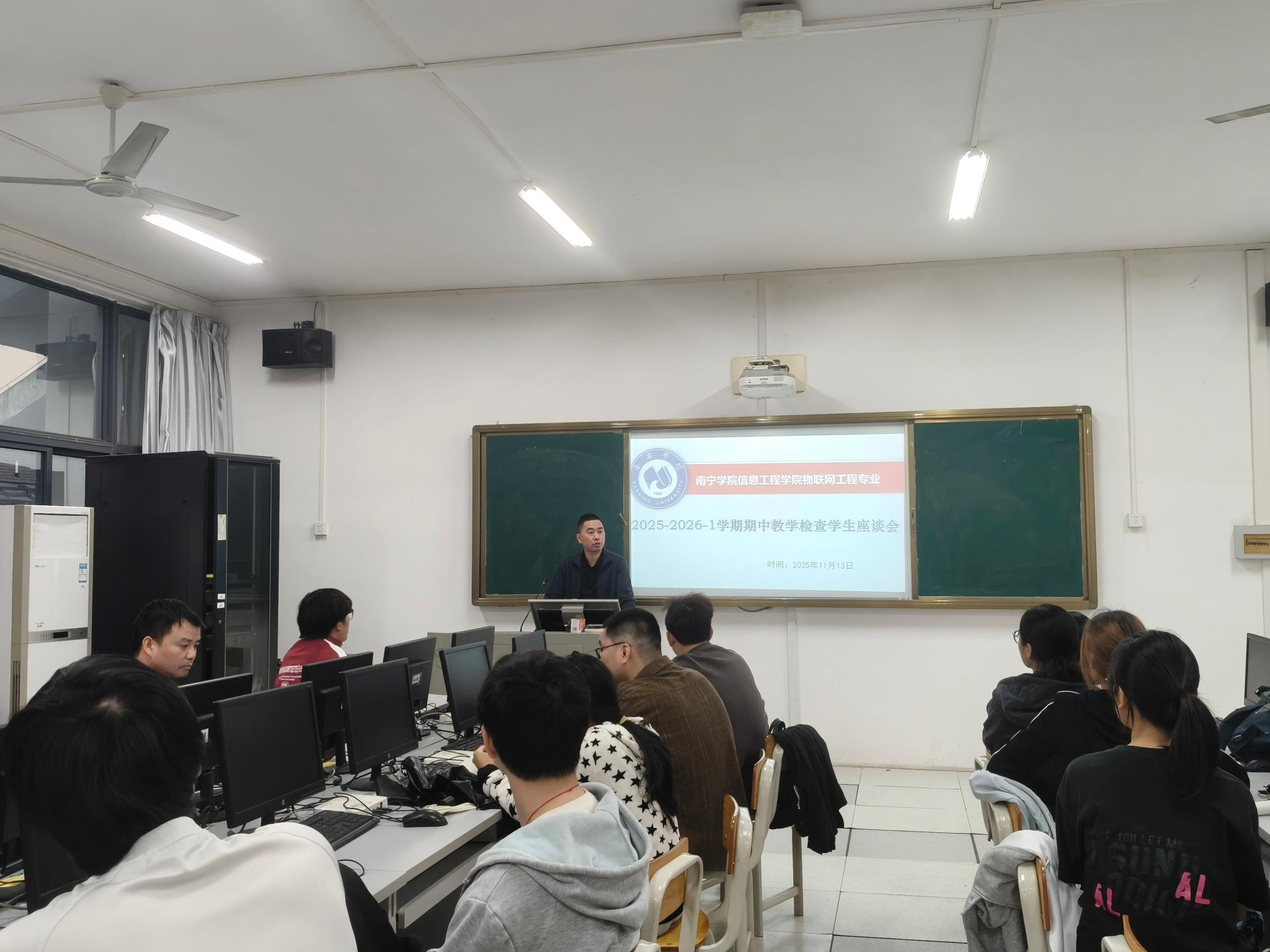 11月13日,信息工程学院物联网工程专业在在南硅谷A506室召开2025-2026学年第1学期期中教学检查师生座谈会。教研室主任汪小威老师、专业课授课教师代表和各级学生代表参会,以“面对面”交流形式共探专业学习与成长之道。