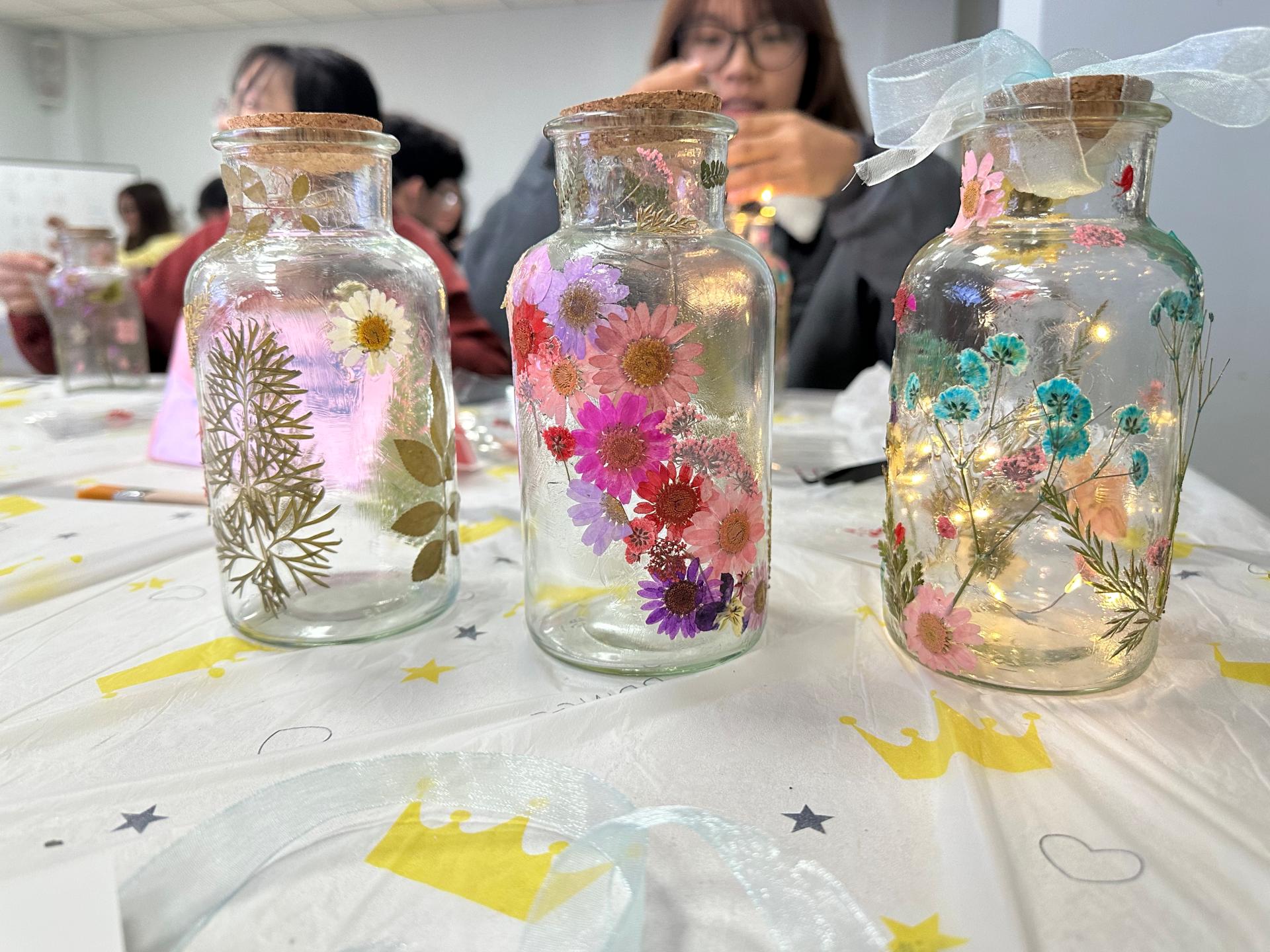 作品完成后,大家自发将压花玻璃瓶整齐摆放在桌上,开启了一场“无评价”的作品赏析会。当暖光灯条同时亮起时,这些压花玻璃瓶成为独一无二的情感载体,光影交错中映照出不同的心境故事。同学们在相互欣赏与交流中,不仅激发了创意,更在情感共鸣中融入了更多的理解与包容,同时强化了朋辈支持与集体归属感。
