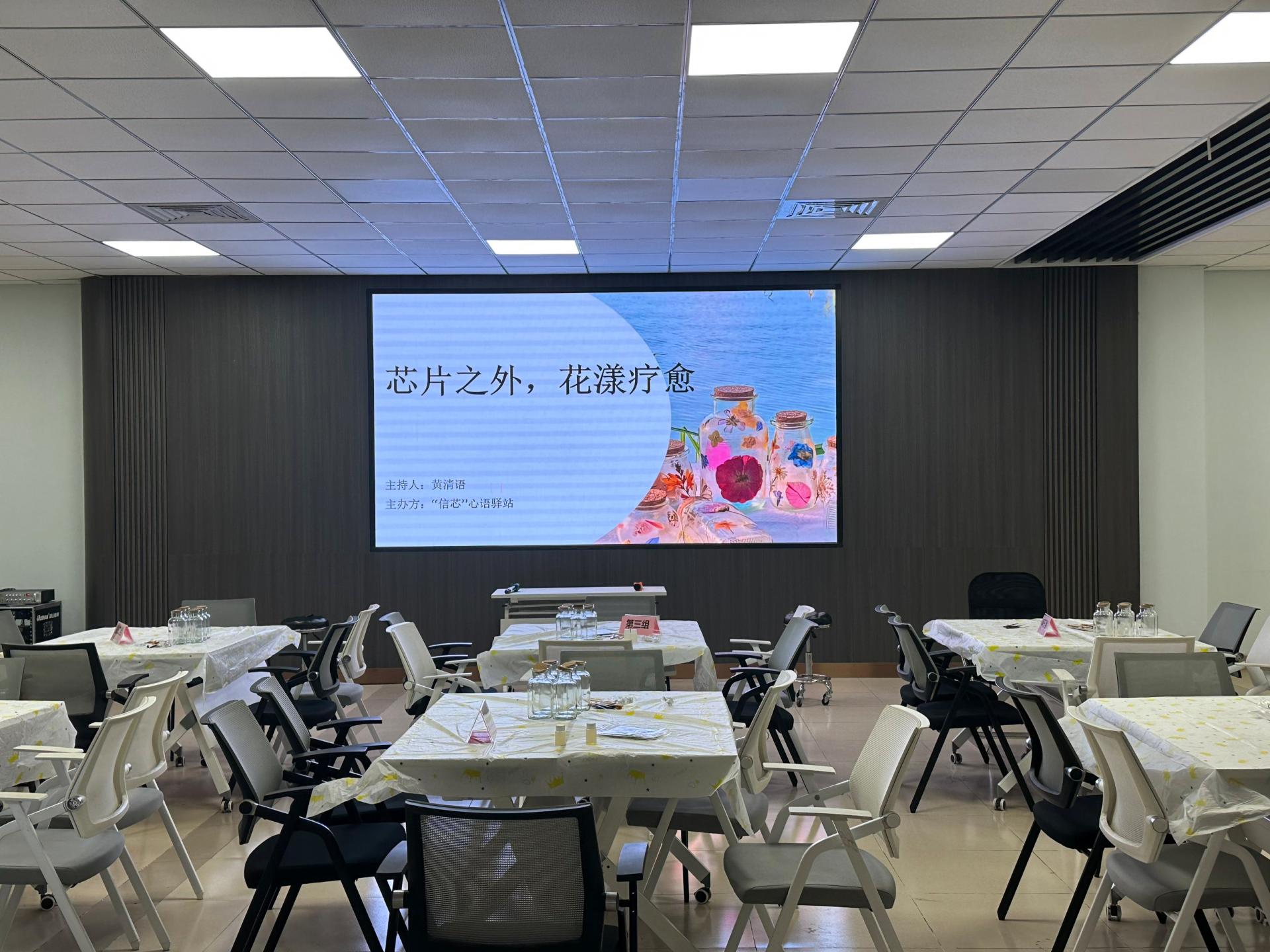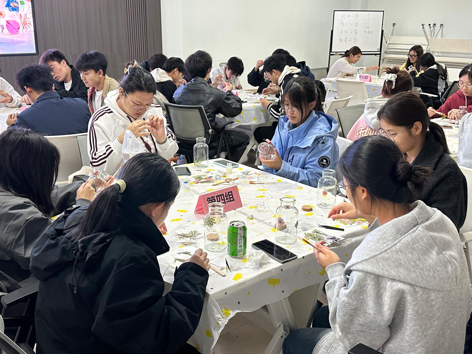 据悉,心语驿站成员提前两周进行心理活动需求调研,最后根据反馈选定了“芯片之外,花漾疗愈”主题,并精选了勿忘我、满天星、洋甘菊等十余种寓意积极的干花材料,以满足不同情绪状态学生的创作偏好与情感投射需求。同时,在活动现场的环境布置上进行充分考究,精选了静心纯音乐,为参与者营造出松弛惬意的创作环境。