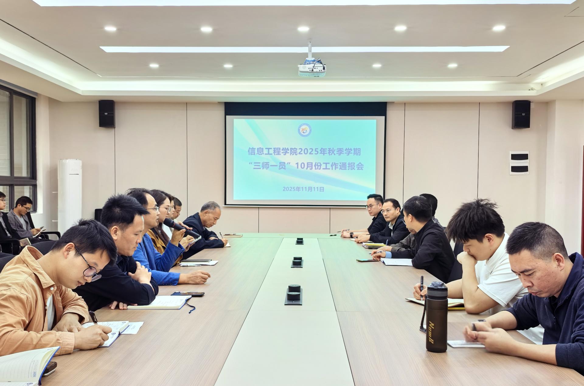 11月11日,信息工程学院在南跬谷A105会议室召开2025年秋季学期“三师一员”10月份工作通报会。学院领导班子成员及“三师一员”队伍成员参加会议,会议由院长李庆年主持。
