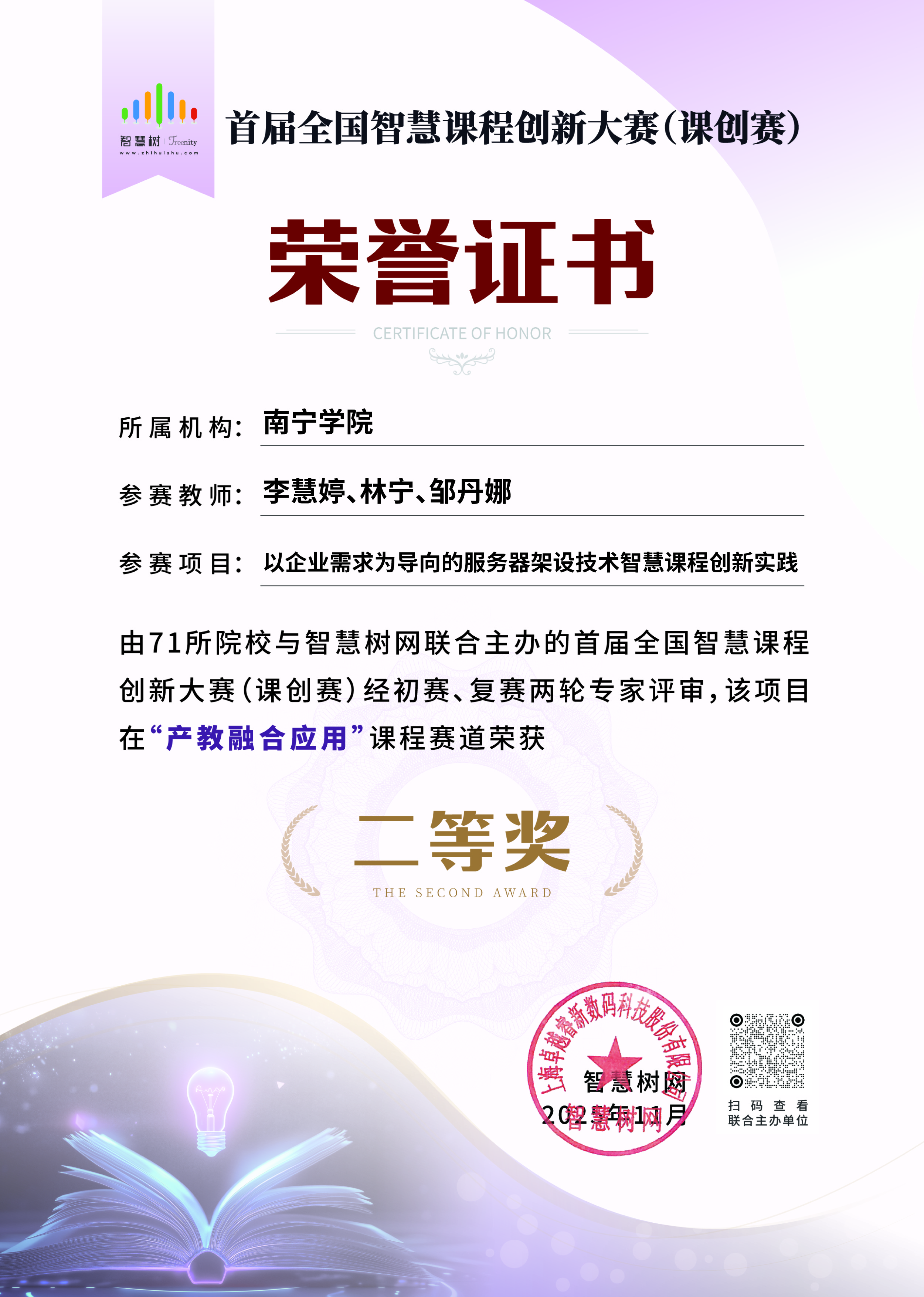 近日,首届“智慧树杯”全国智慧课程创新大赛获奖名单正式公布。由我院教师李慧婷、林宁携手华为企业教师邹丹娜联合申报的《服务器架设技术》智慧课程脱颖而出,荣获大赛二等奖,为学院赢得了荣誉。