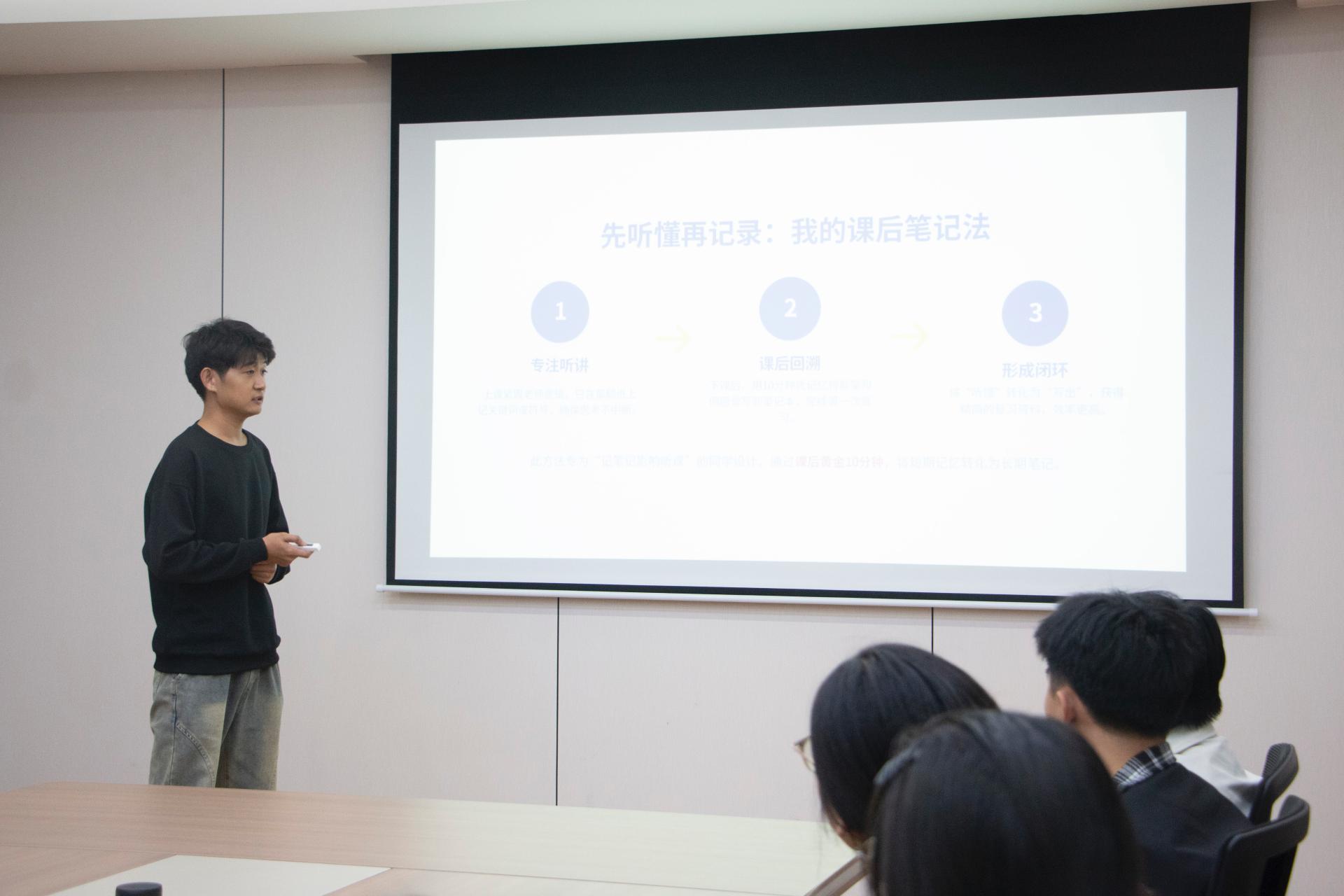 首位分享的是来自2024级计算机科学与技术1班的李帅同学,他从课程预习、课堂听讲、课后复习三个环节入手,详细介绍了如何构建知识体系、提高学习效率,为新生们提供了切实可行的学习指南。