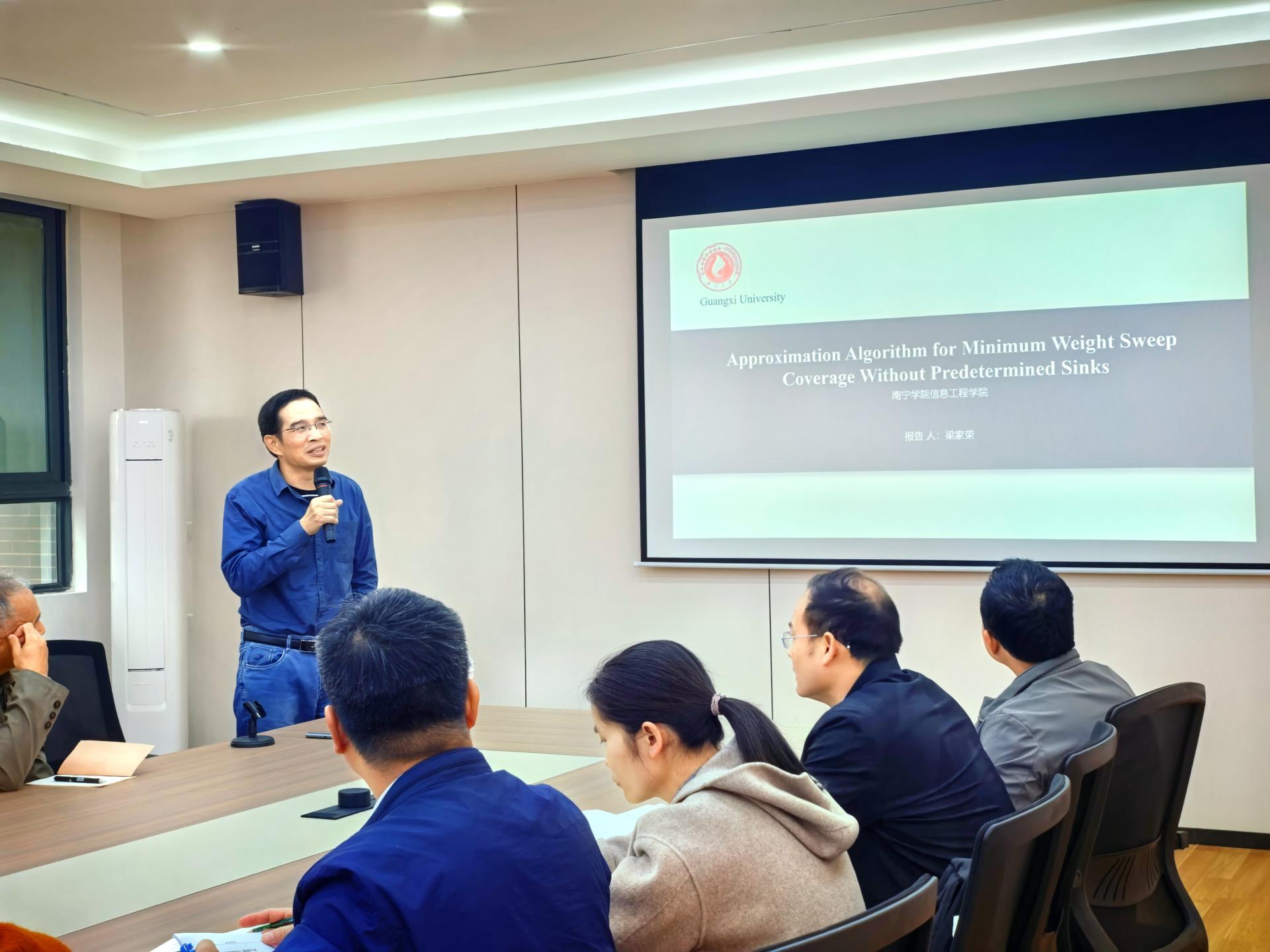 讲座开始前,李庆年院长对梁家荣教授的到来表示热烈欢迎,并简要介绍了梁教授的学术成就。随后,梁家荣教授以《Approximation Algorithm for Minimum Weight Sweep Coverage Without Predetermined Sinks》为题,系统阐述其在无线传感器网络扫描覆盖问题上的最新研究成果。
