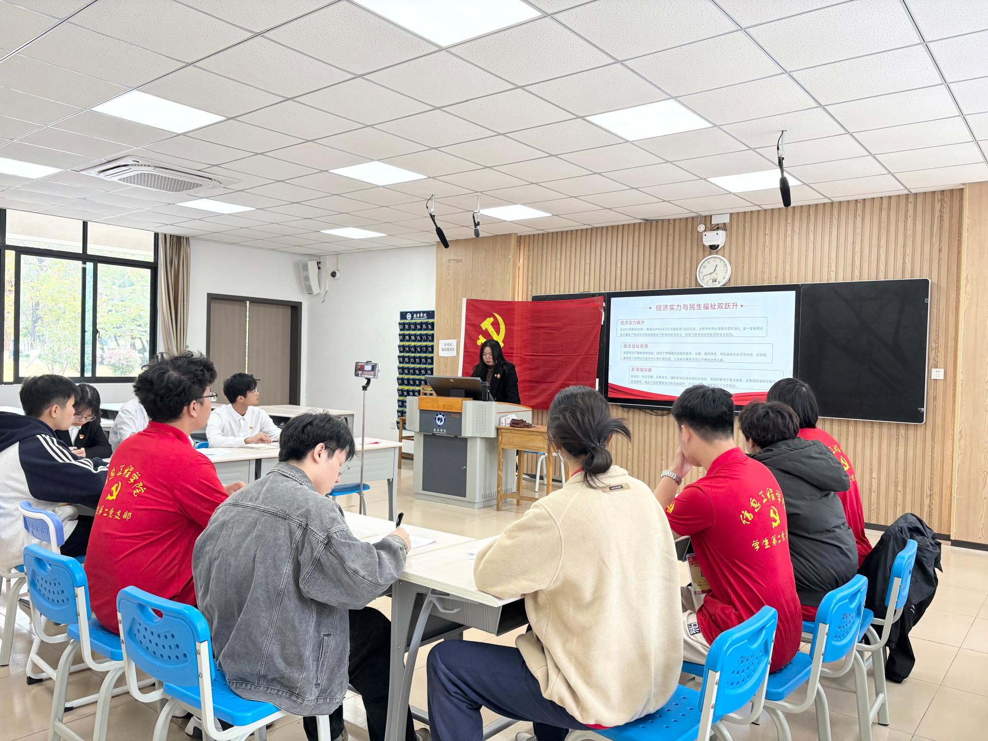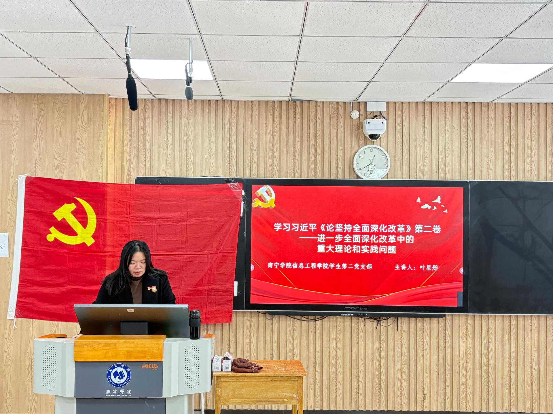 12月15日,信息工程学院学生第二党支部在敷文园A113举行专题党课,集中学习习近平《论坚持全面深化改革》第二卷——“进一步全面深化改革中的重大理论和实践问题”。本次党课由支部书记叶星彤主讲,支部全体学生党员参加学习。由叶星彤书记主讲,全体学生党员参与。