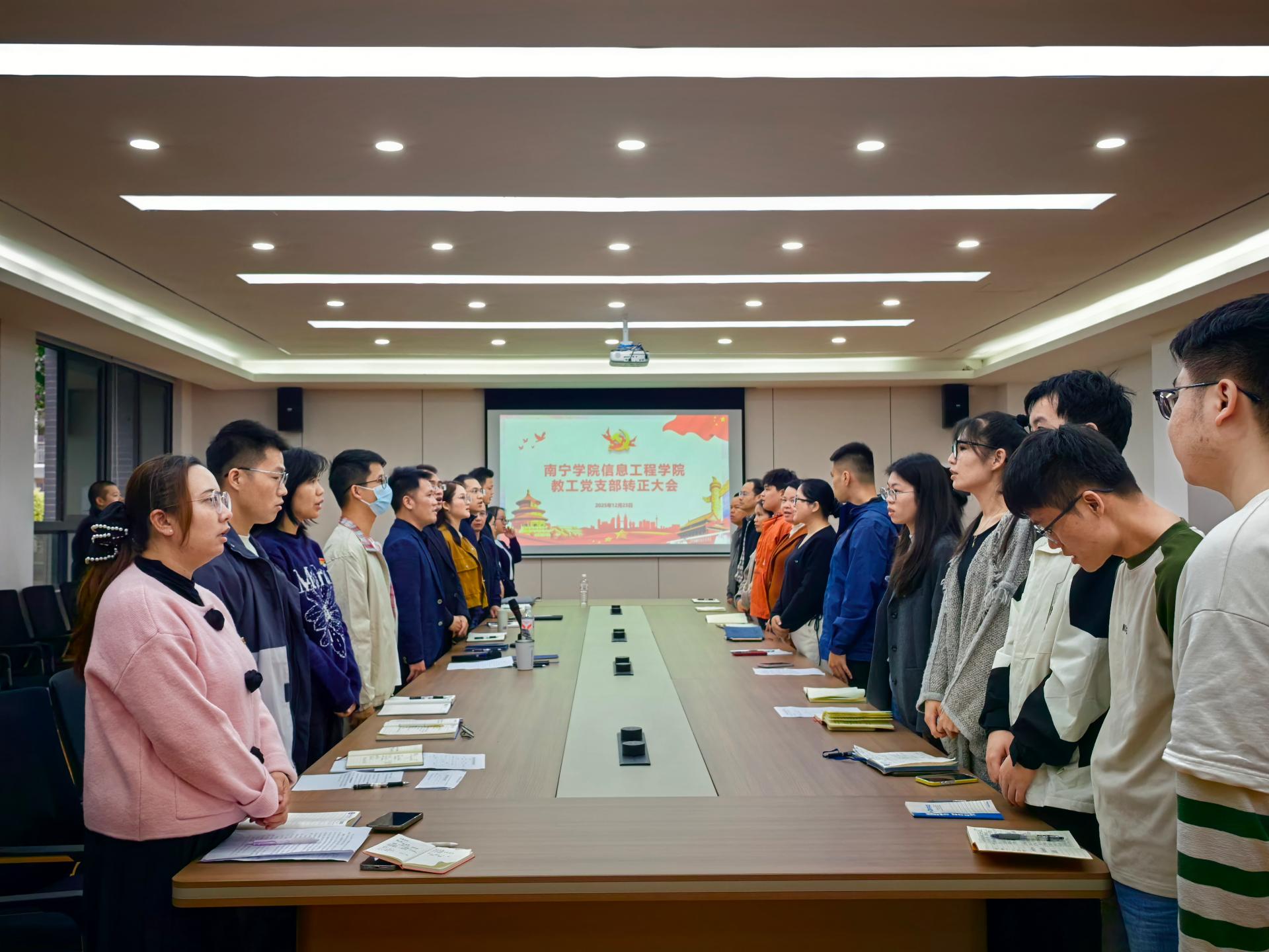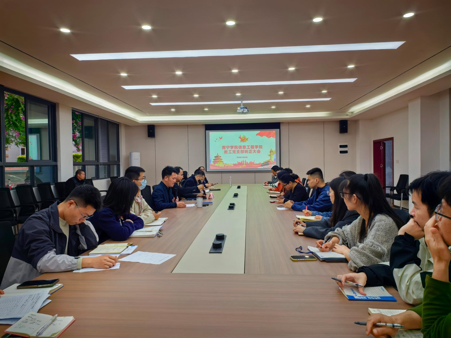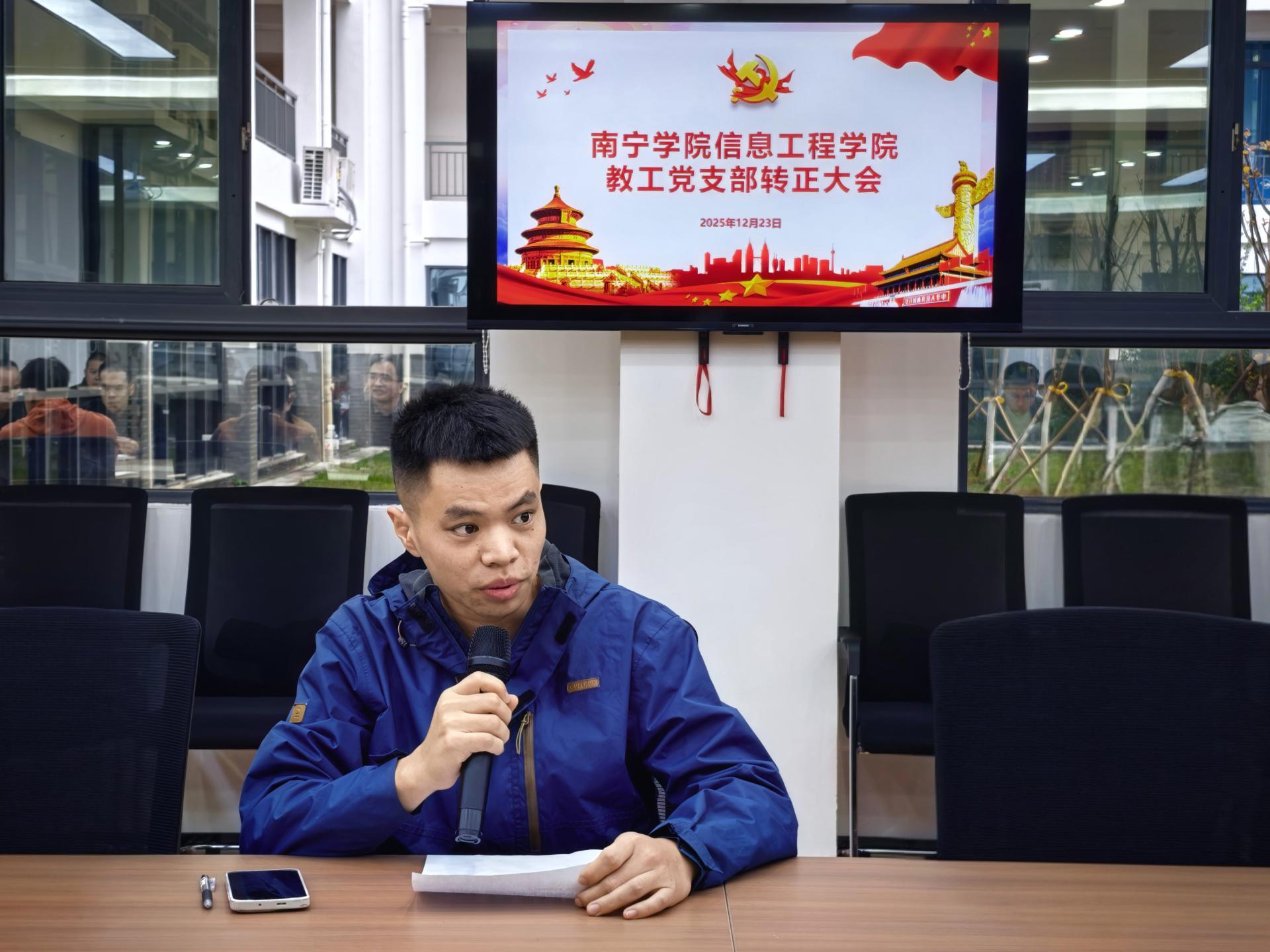 2025年12月23日,南宁学院信息工程学院教工党支部召开党员大会,讨论审议梁健淼同志由预备党员转为正式党员的相关事宜。会议由教工党支部书记陈积常主持。