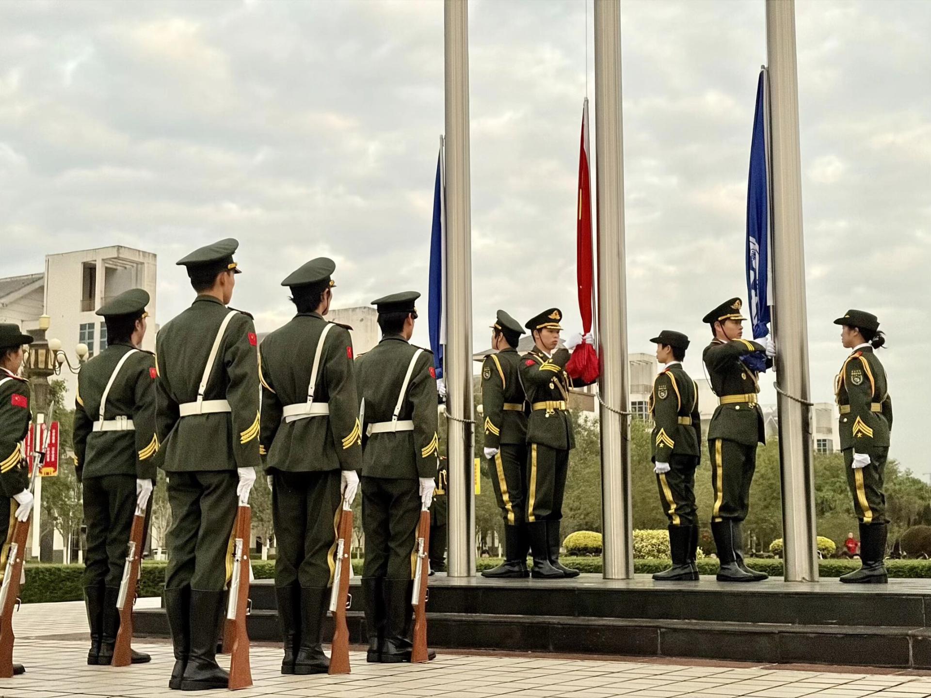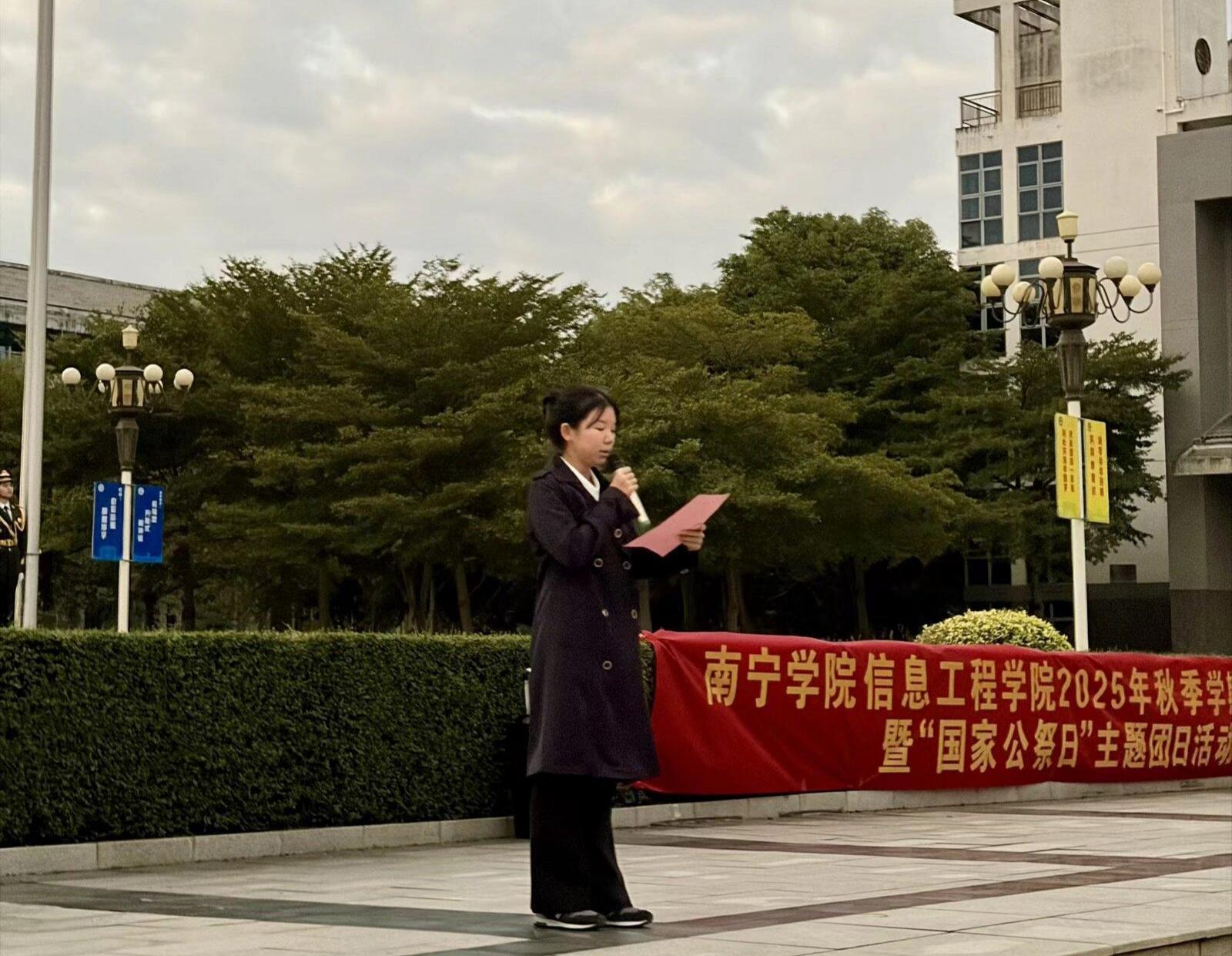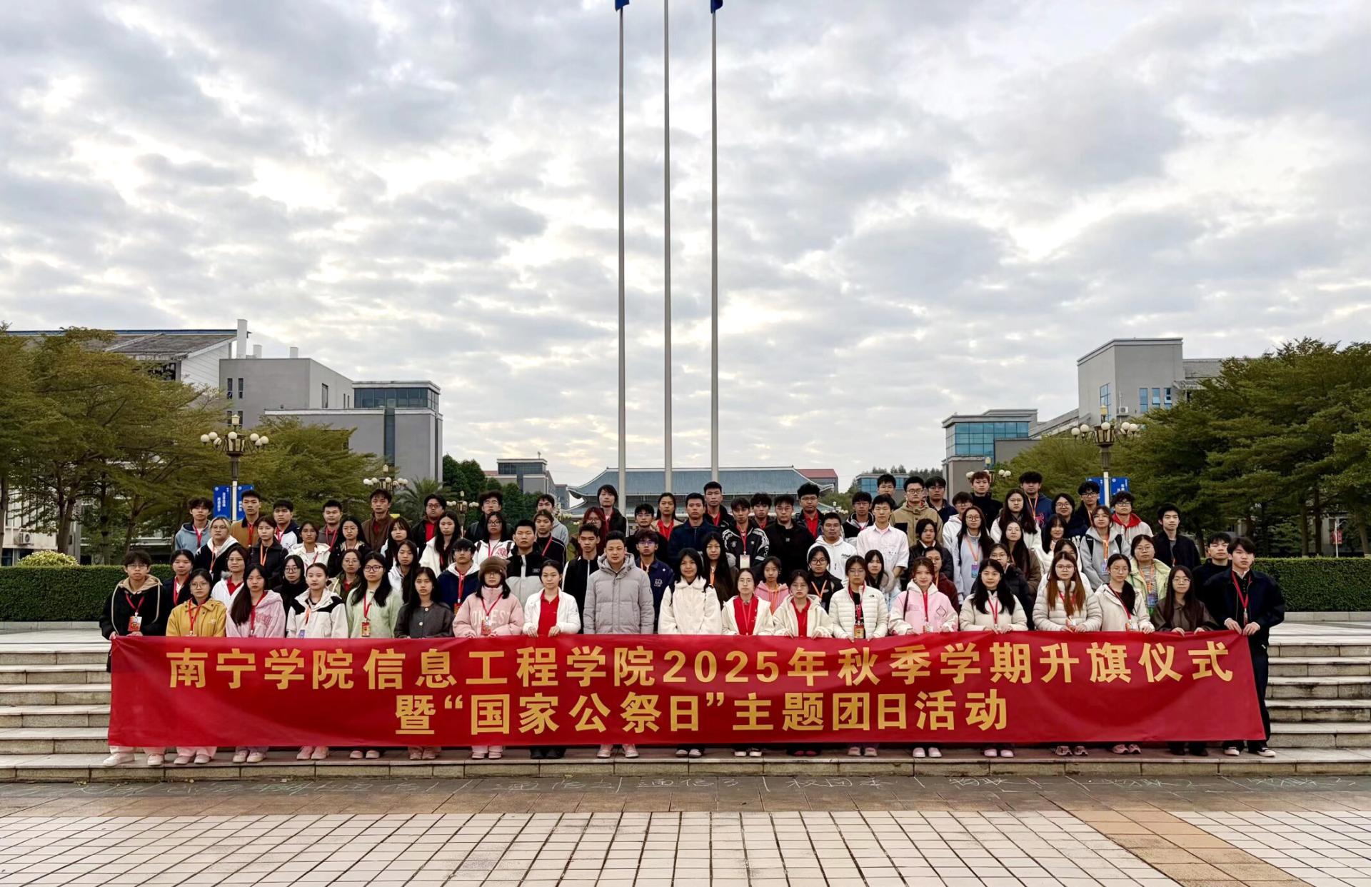 2025年12月15日清晨,南宁学院信息工程学院于南门升旗台前举行升旗仪式暨“国家公祭日”主题活动,2025级全体同学、教师代表及全体学生干部共同参与,以庄严的仪式缅怀遇难同胞、传承英烈精神,铭记历史,不忘使命。此次升旗仪式由韦泽佳主持。