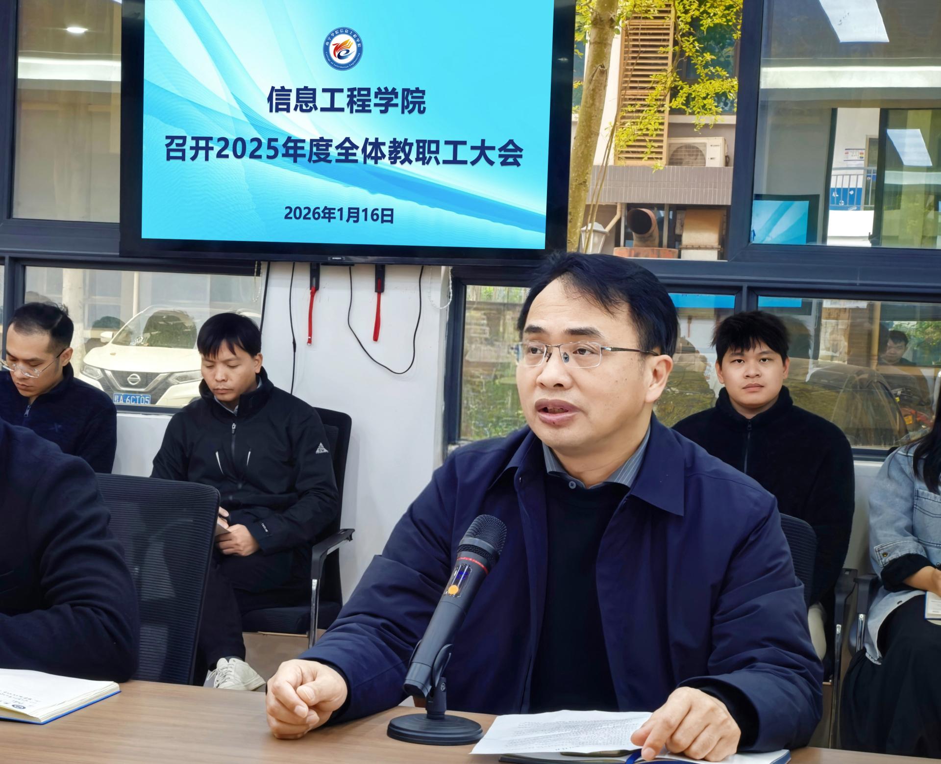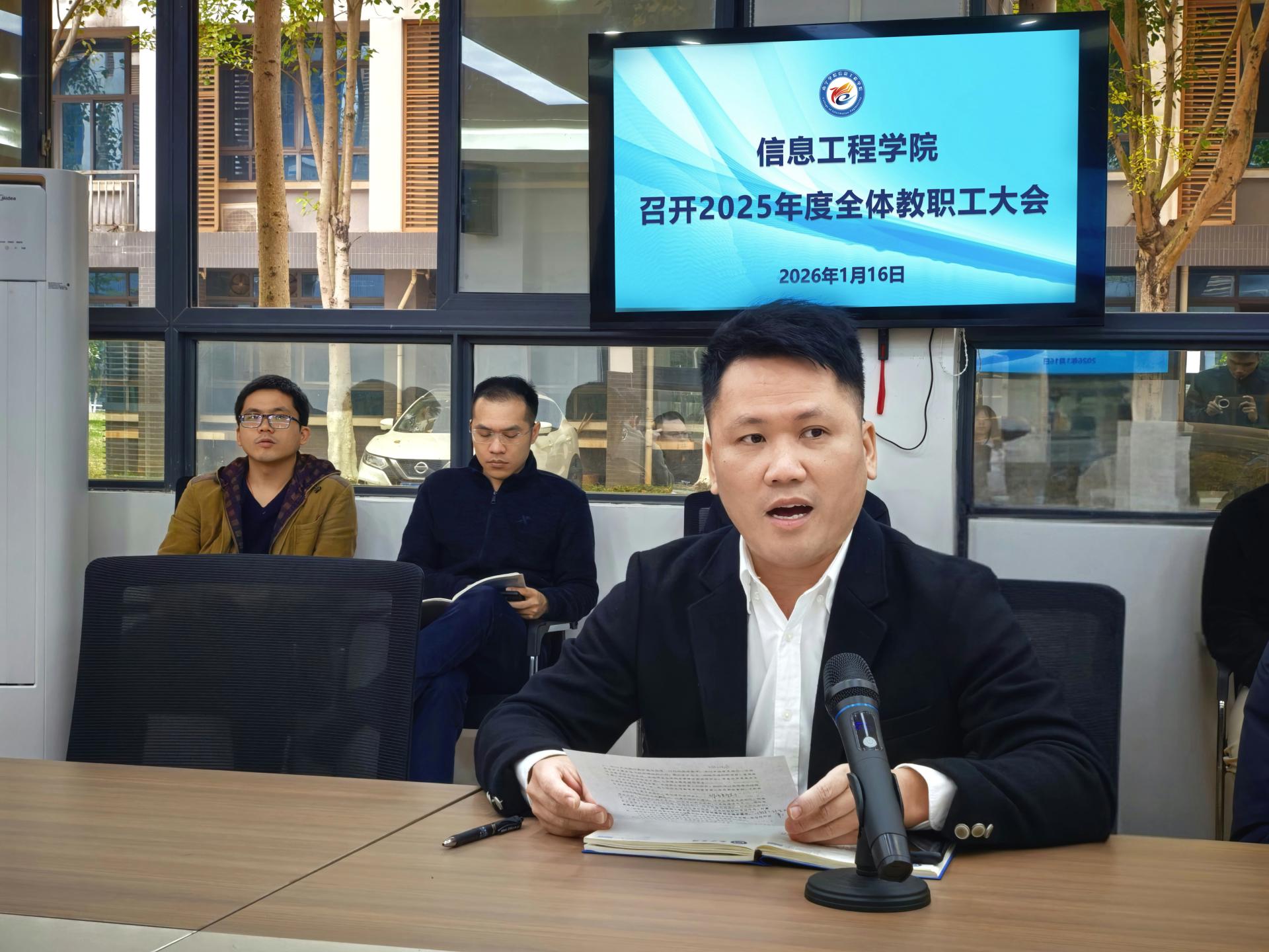2026年1月16日,信息工程学院在南跬谷A105会议室召开2025年度全体教职工大会,全面总结过去一年的工作,部署新一年的任务,并组织开展学院领导班子述职评议与教职工年度考核工作。学院全体教职工参加大会。