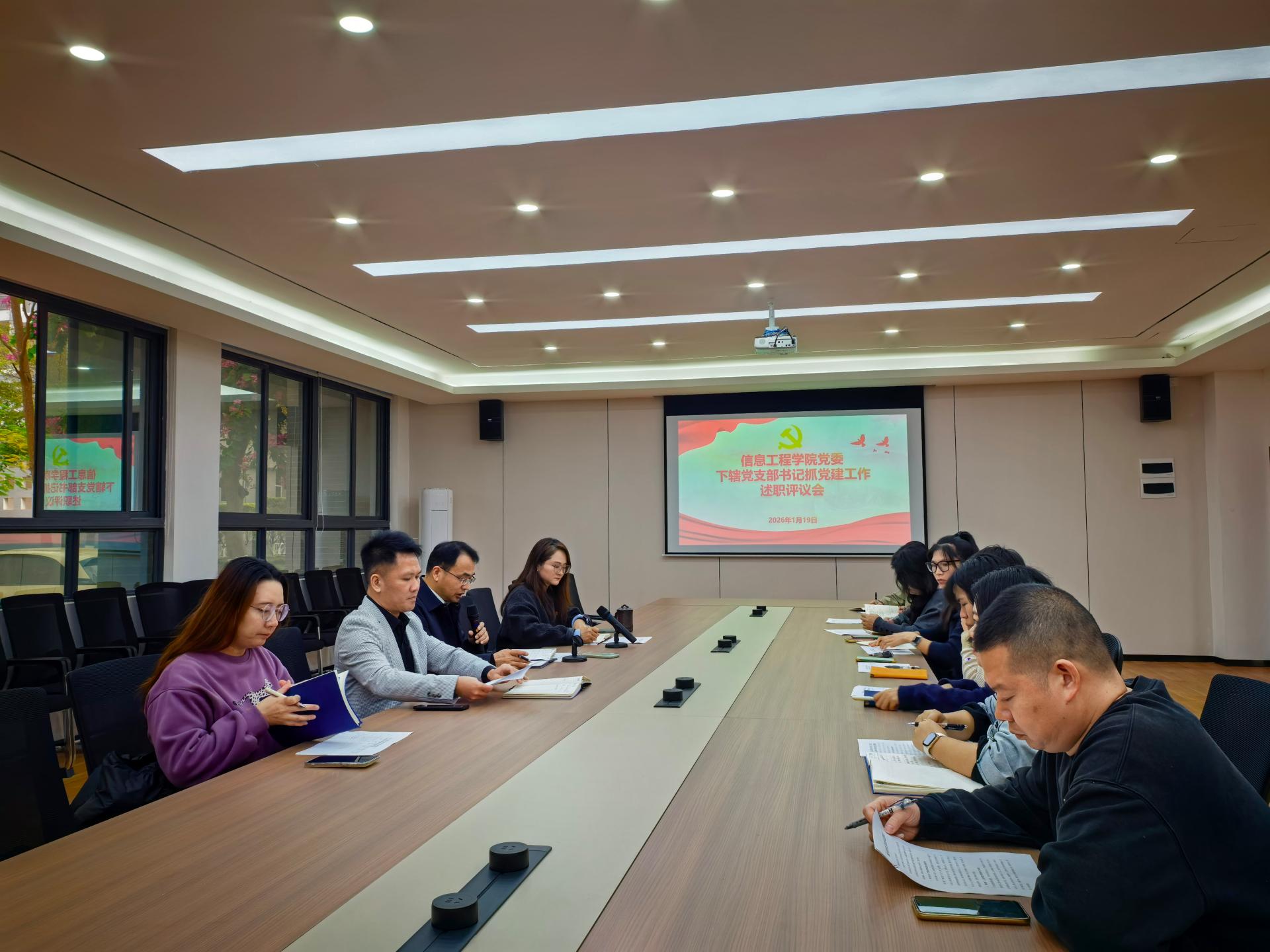 2026年1月19日上午,信息工程学院党委在南硅谷A105会议室召开2025年度下辖党支部书记抓党建工作述职评议会。学院党委书记、院长李庆年主持会议,学院党委副书记廖秀媛,党委委员、各党支部书记及党员代表参加会议。