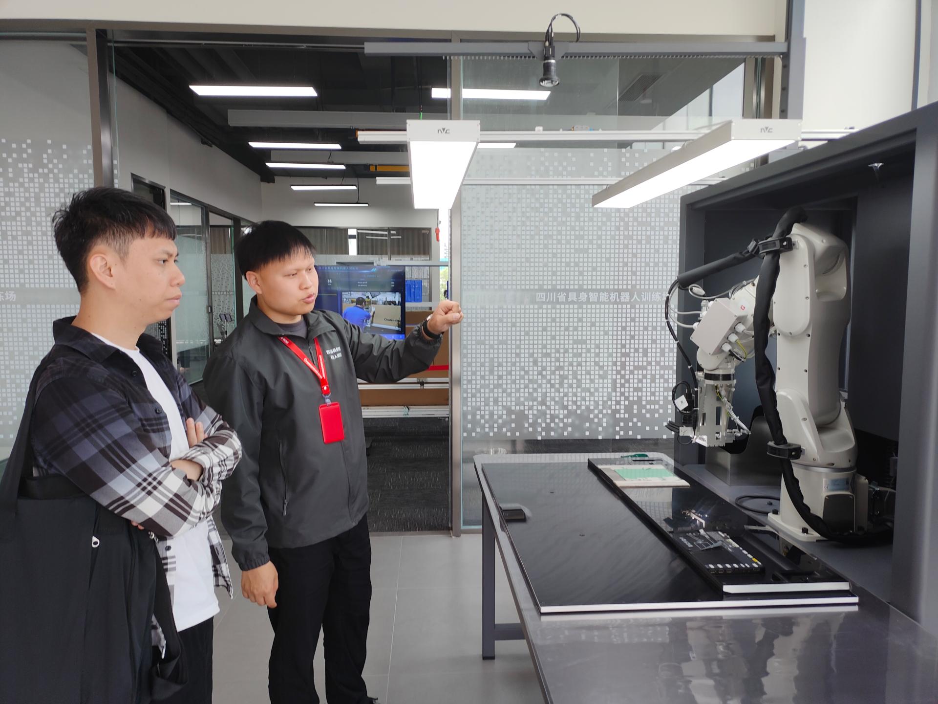 参观过程中,四川省具身智能机器人训练场负责人张维,详细介绍了训练场的运营现状与核心工作。现场配备26台不同型号的智能机器人,已构建起数据采集、模型训练、场景测试、优化迭代的全流程工作体系。其中,每日需大量操作手操控机器人与场景交互,完成数据采集与标注工作,为算法优化完善提供坚实数据支撑。该训练体系实现标准化、规模化运行,其工作内容与计算机大类专业高度契合,可为校企合作提供真实实训场景及优质数据资源,助力学生快速对接行业实战需求,提升技术应用与工程实践能力。