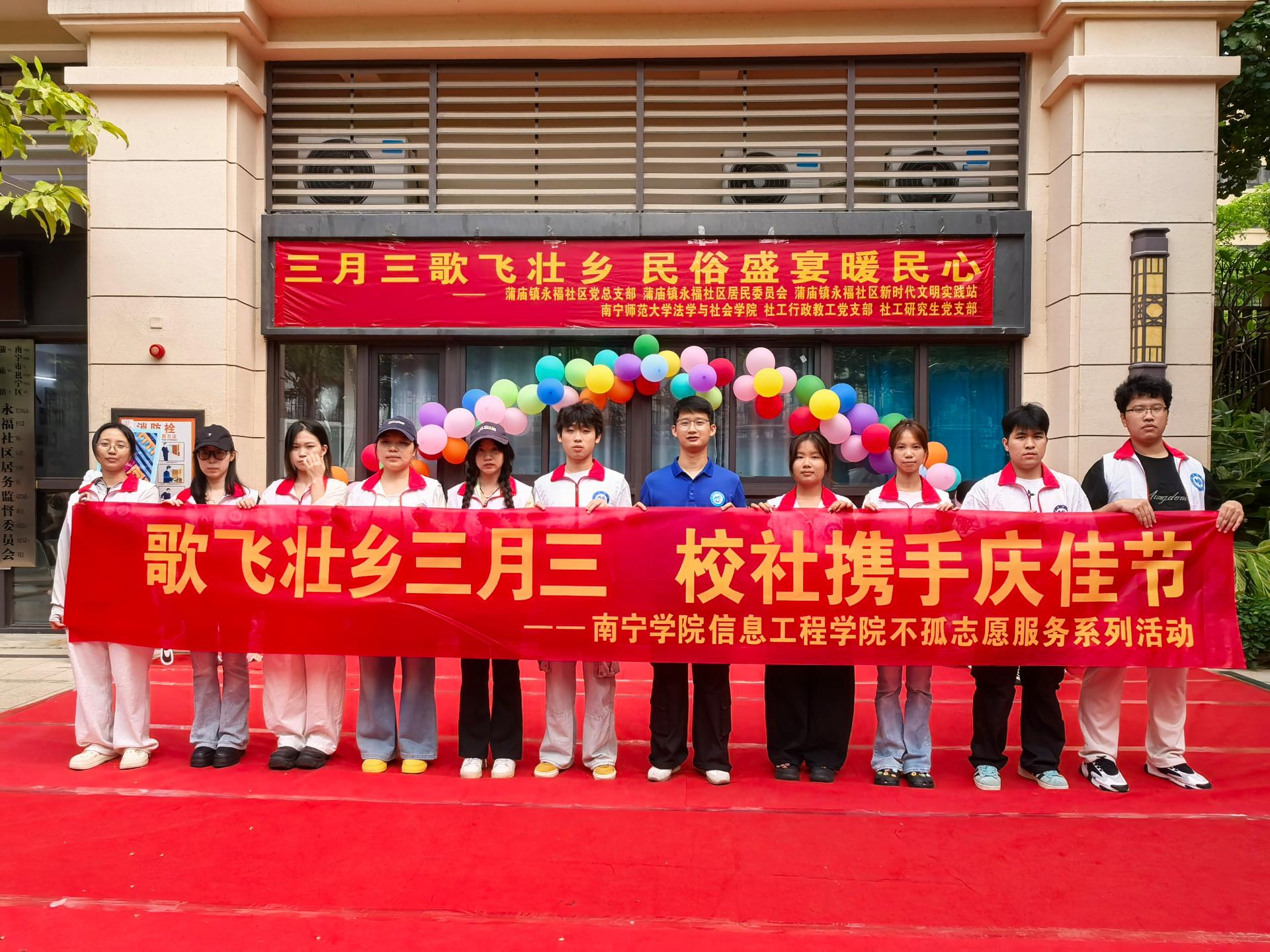 为深入推进“校社共建”融合发展,传承弘扬广西壮族优秀传统文化,4月15日,南宁学院信息工程学院组织“不孤”志愿服务队走进蒲庙镇永福社区,积极参与社区“三月三歌飞 壮乡民俗盛宴暖民心”主题活动,以青春力量助力社区文化惠民,用实际行动践行青年担当。