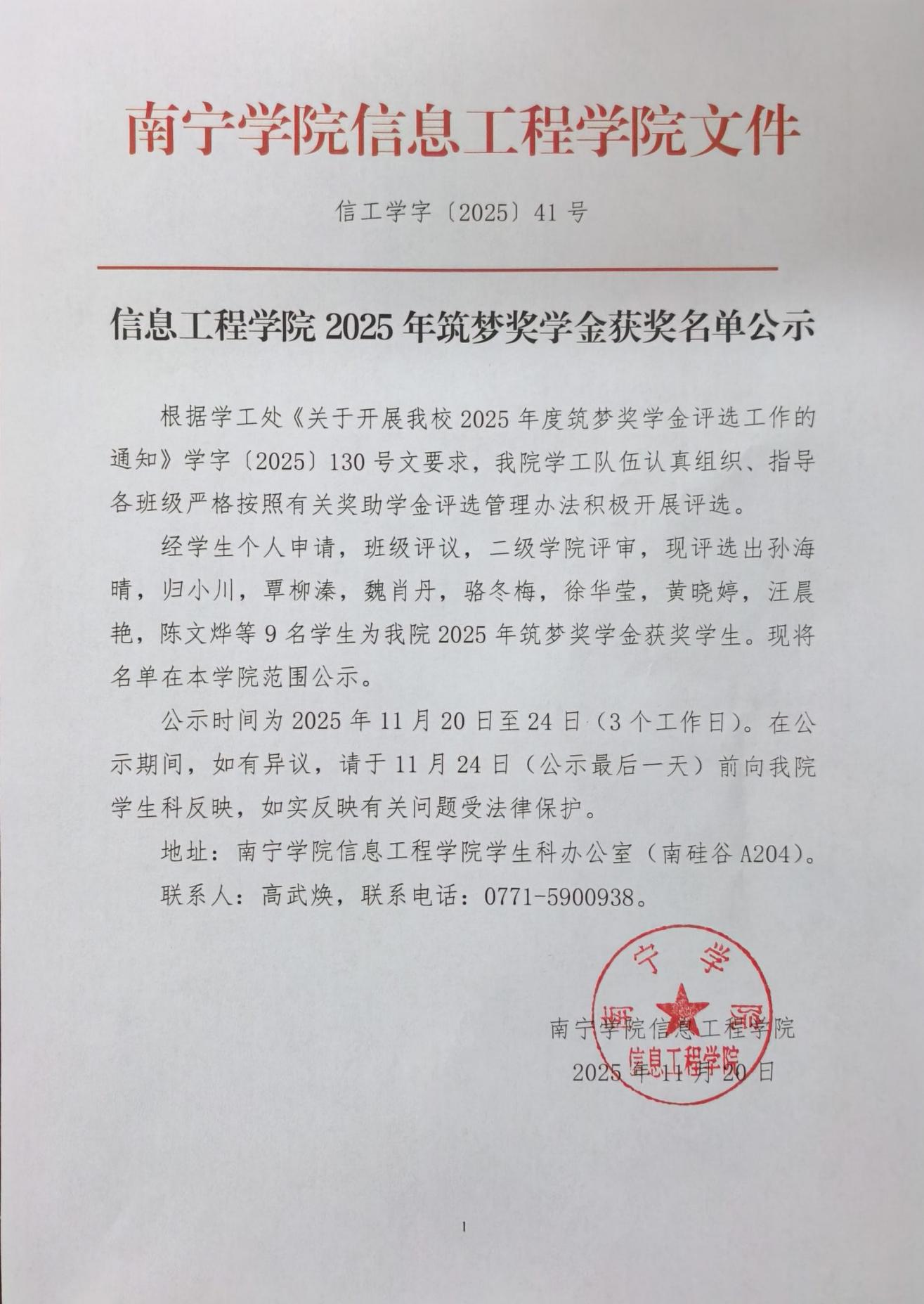 【公告】信息工程学院2025年筑梦奖学金获奖名单公示